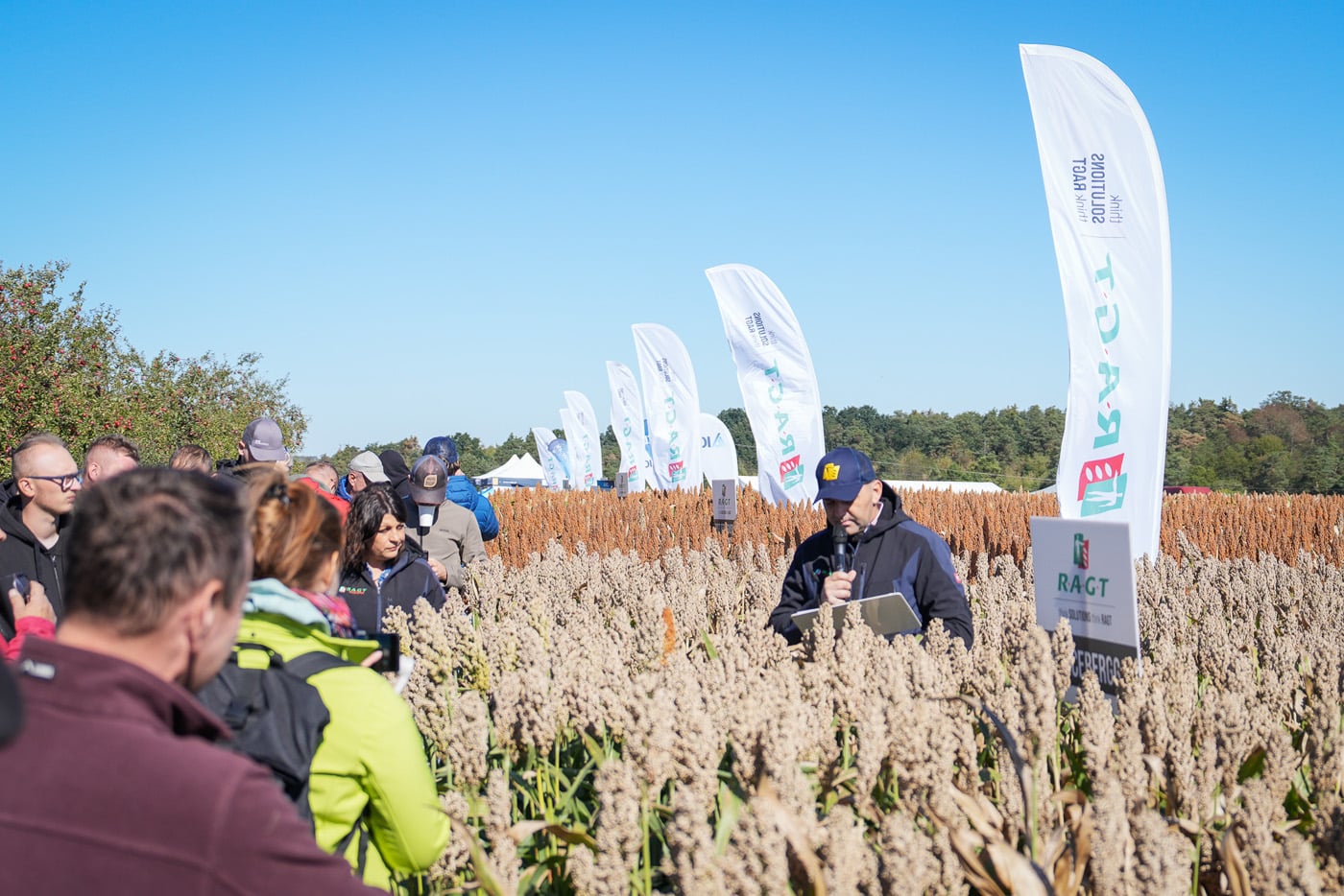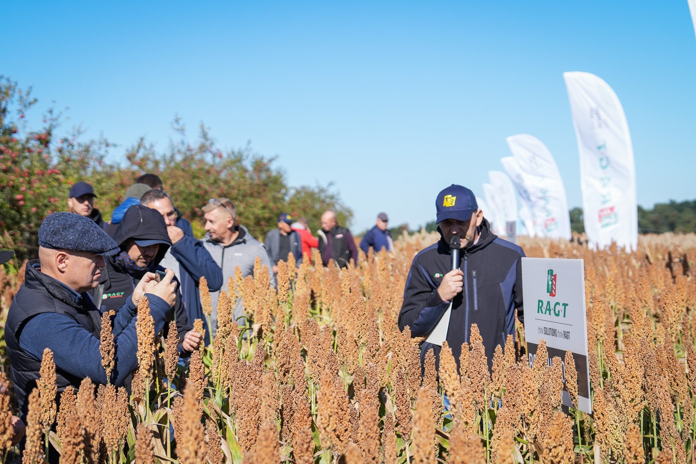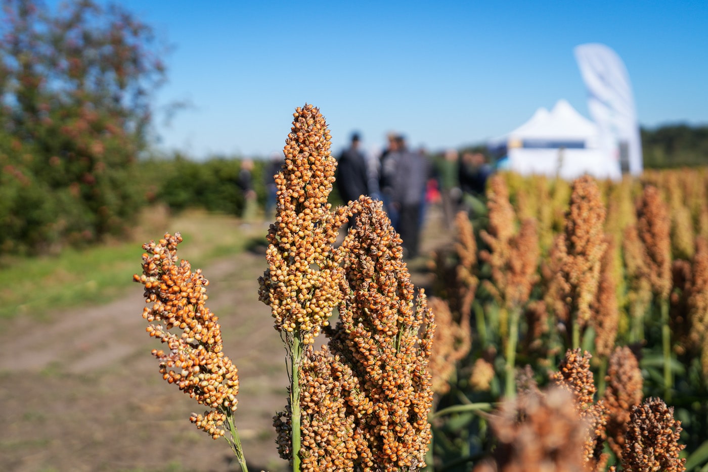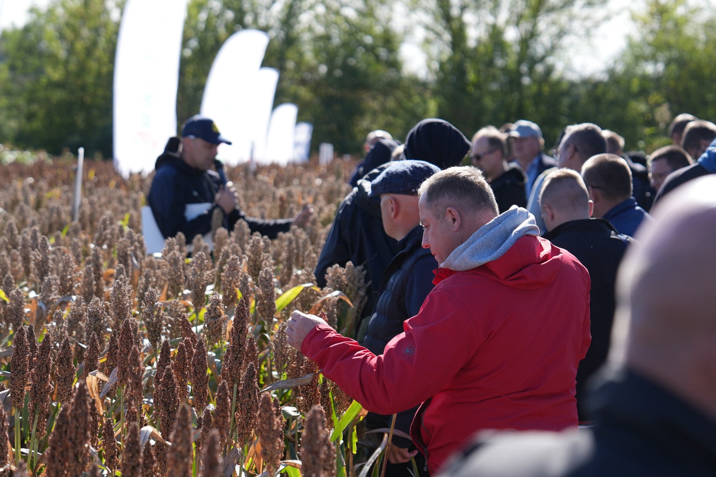 Na demonstracyjnej plantacji zaprezentowano kilkanaście odmian sorgo przeznaczonego do uprawy na ziarno (np. RGT Lggend, RGT Icebergg, RGT Belugga) oraz odmiany kiszonkowe i sorgo przeznaczone do produkcji biogazu (np.  RGT Amiggo). Wspólnie z uczestnikami polowego spotkania przyjrzeliśmy się wyjątkowym roślinom na kolekcji demonstracyjnej obejmującej szeroki przekrój odmian o różnym wybarwieniu, budowie roślin i przeznaczeniu.