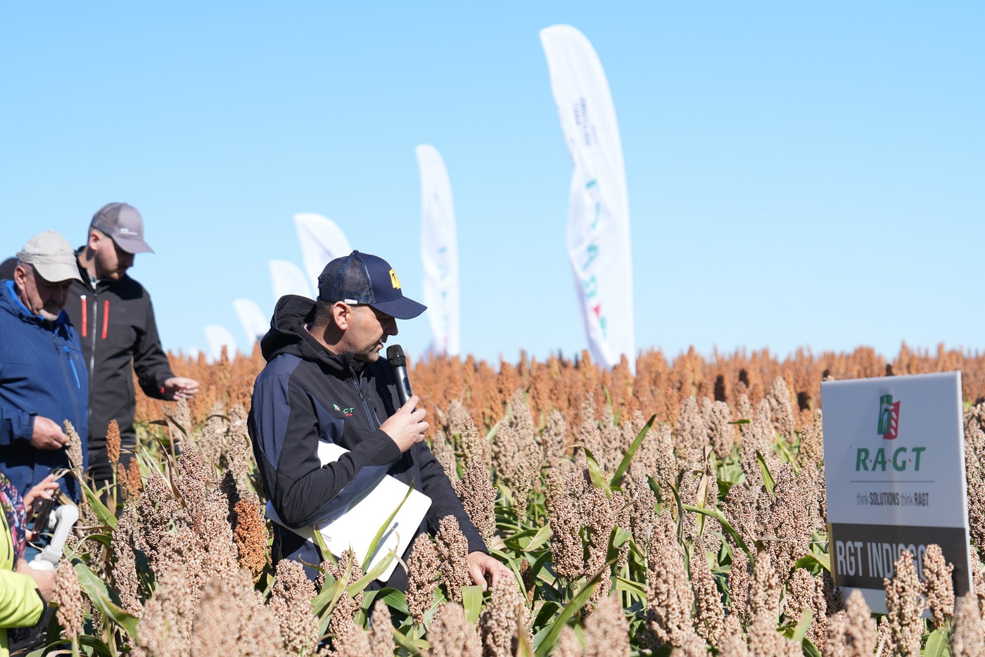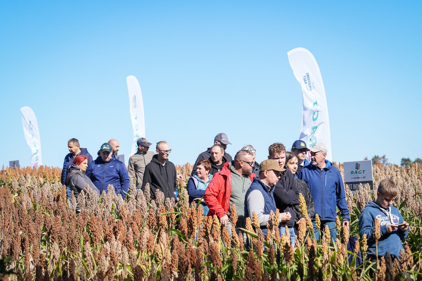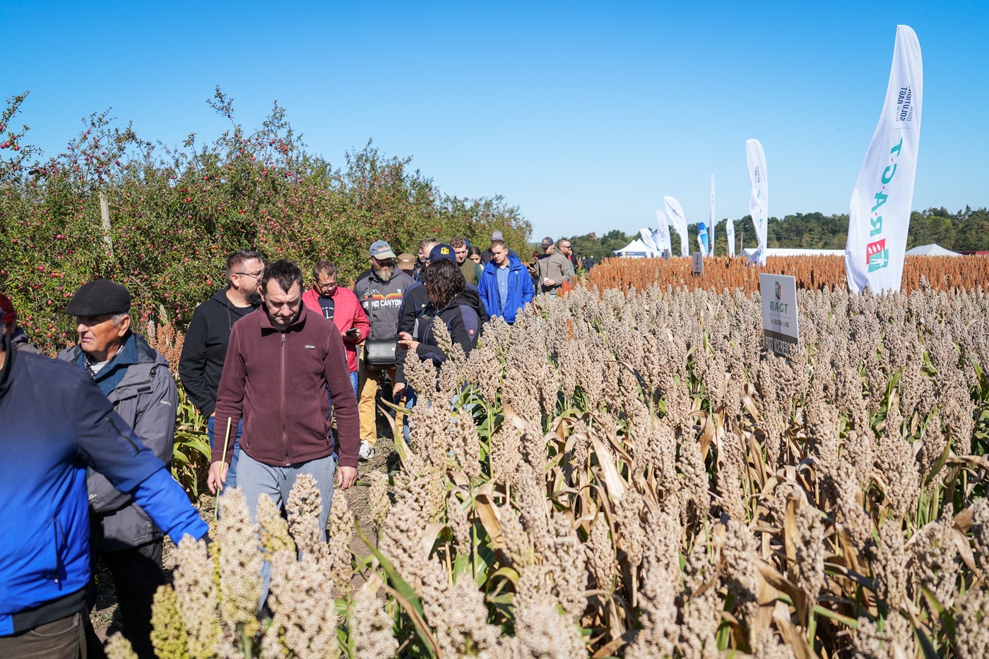 Na demonstracyjnej plantacji zaprezentowano kilkanaście odmian sorgo przeznaczonego do uprawy na ziarno (np. RGT Lggend, RGT Icebergg, RGT Belugga) oraz odmiany kiszonkowe i sorgo przeznaczone do produkcji biogazu (np.  RGT Amiggo). Wspólnie z uczestnikami polowego spotkania przyjrzeliśmy się wyjątkowym roślinom na kolekcji demonstracyjnej obejmującej szeroki przekrój odmian o różnym wybarwieniu, budowie roślin i przeznaczeniu.