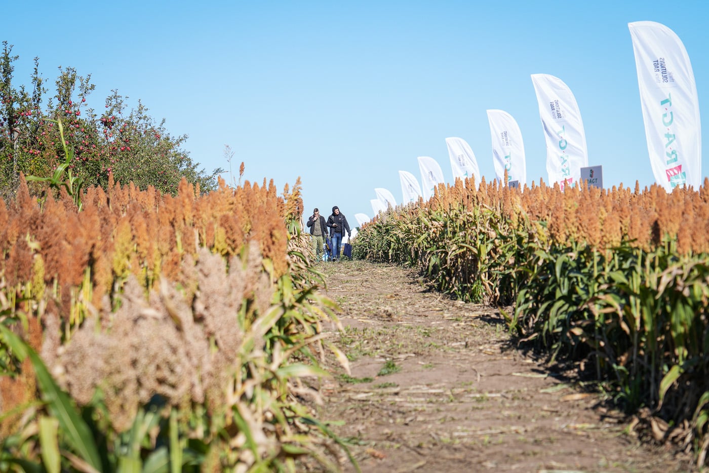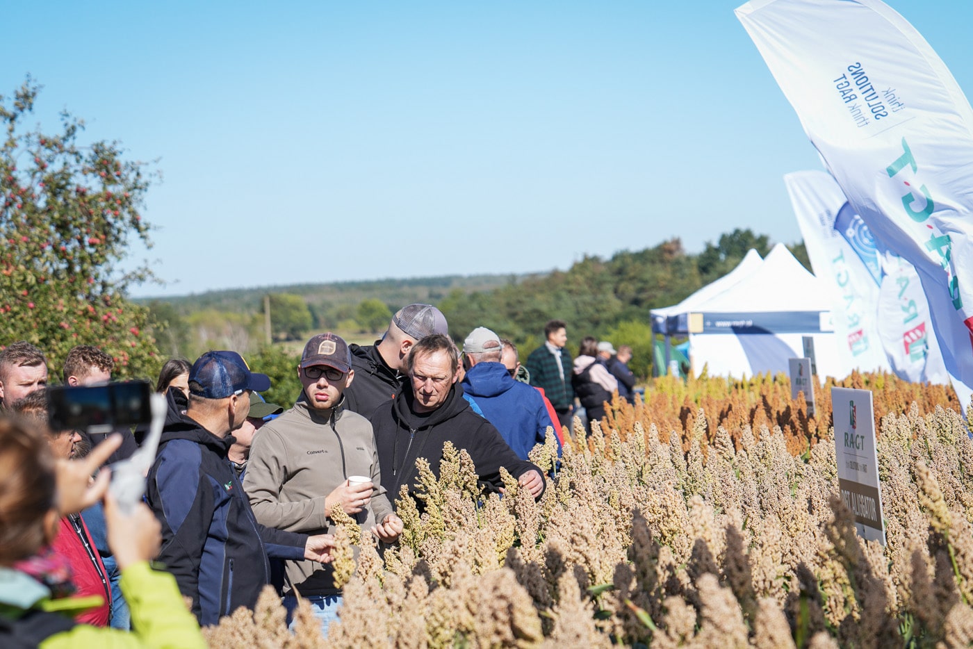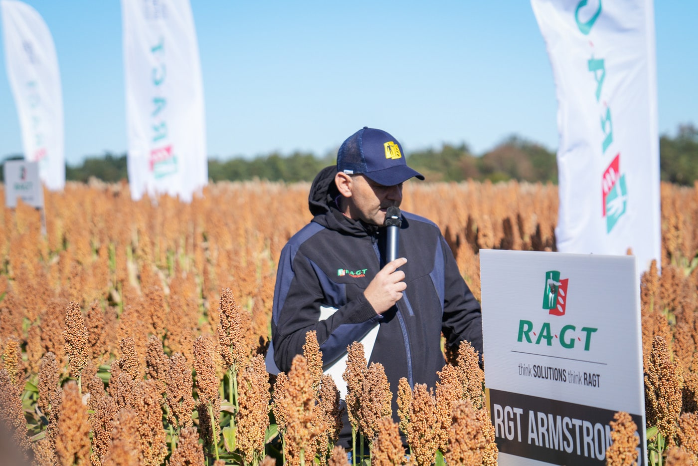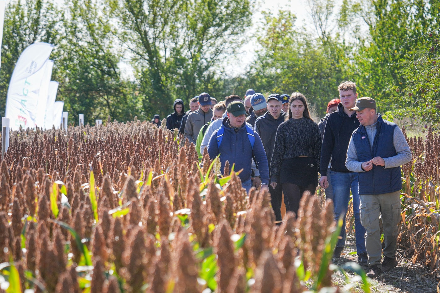 Na demonstracyjnej plantacji zaprezentowano kilkanaście odmian sorgo przeznaczonego do uprawy na ziarno (np. RGT Lggend, RGT Icebergg, RGT Belugga) oraz odmiany kiszonkowe i sorgo przeznaczone do produkcji biogazu (np.  RGT Amiggo). Wspólnie z uczestnikami polowego spotkania przyjrzeliśmy się wyjątkowym roślinom na kolekcji demonstracyjnej obejmującej szeroki przekrój odmian o różnym wybarwieniu, budowie roślin i przeznaczeniu.